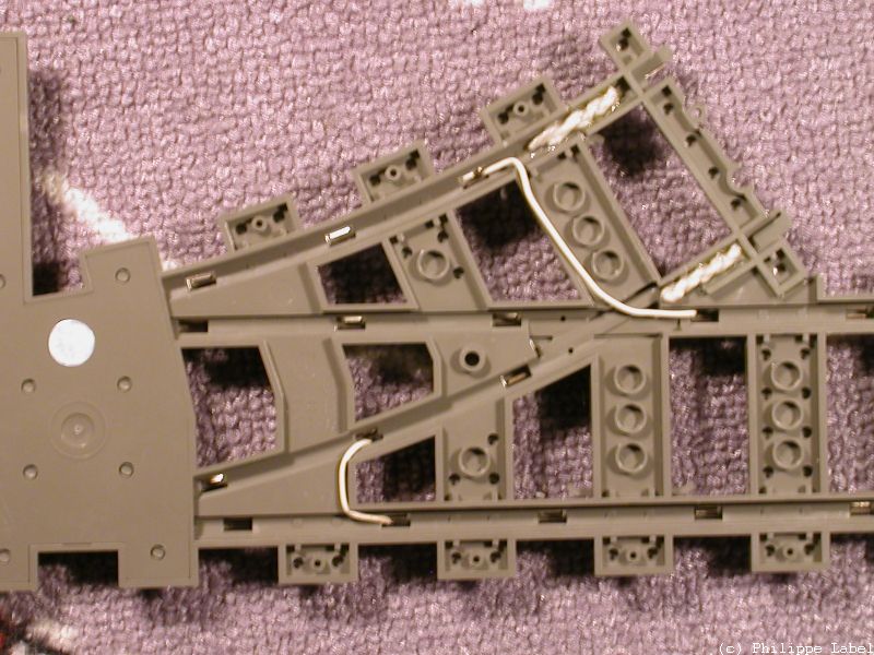 Cette photo montre les points où les fils seront soudés sur le rail. La soudure est effectué sur l'extérieur du rail, là où la roue ne passe jamais. Pas sur le dessus ni sur l'intérieur. nb : l'aiguillage est à géométrie modifiée, cela n'a pas d'importance pour ces explications. |