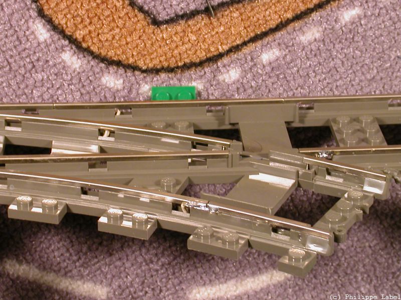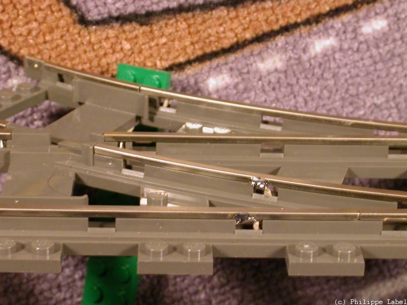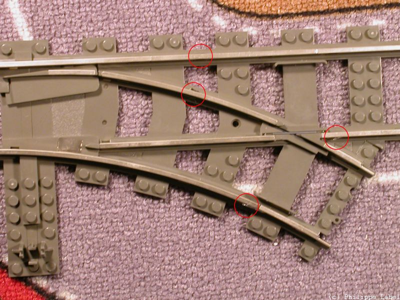 This picture shows you the points where wire ends will be solder to the rail. Soldering is done on the outer side of the rail, where the train wheels never go. Neither on top of rail, nor on inner side. nb: the switch point has a modified geometry, it has no importance for these explanations. |